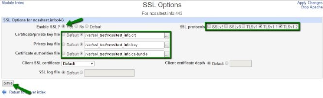 7、在打开的页面上,为“Enable SSL?”选择“Yes” 。并在页面右侧打勾/取消选中必要的SSL / TLS协议。然后在相应的字段中指定域证书,私钥和CA捆绑软件文件的路径,并勾选相应的单选按钮,以便系统可以找到这些文件。单击保存按钮。如果执行的操作后没有错误消息,则说明EV SSL证书已成功安装。
